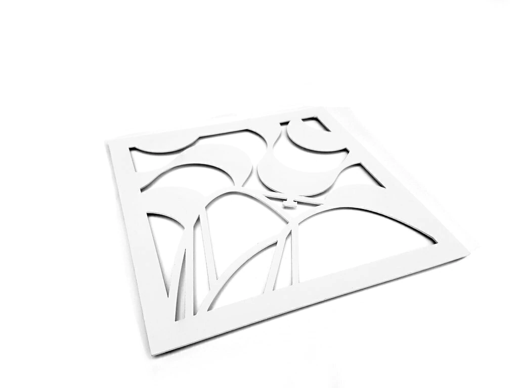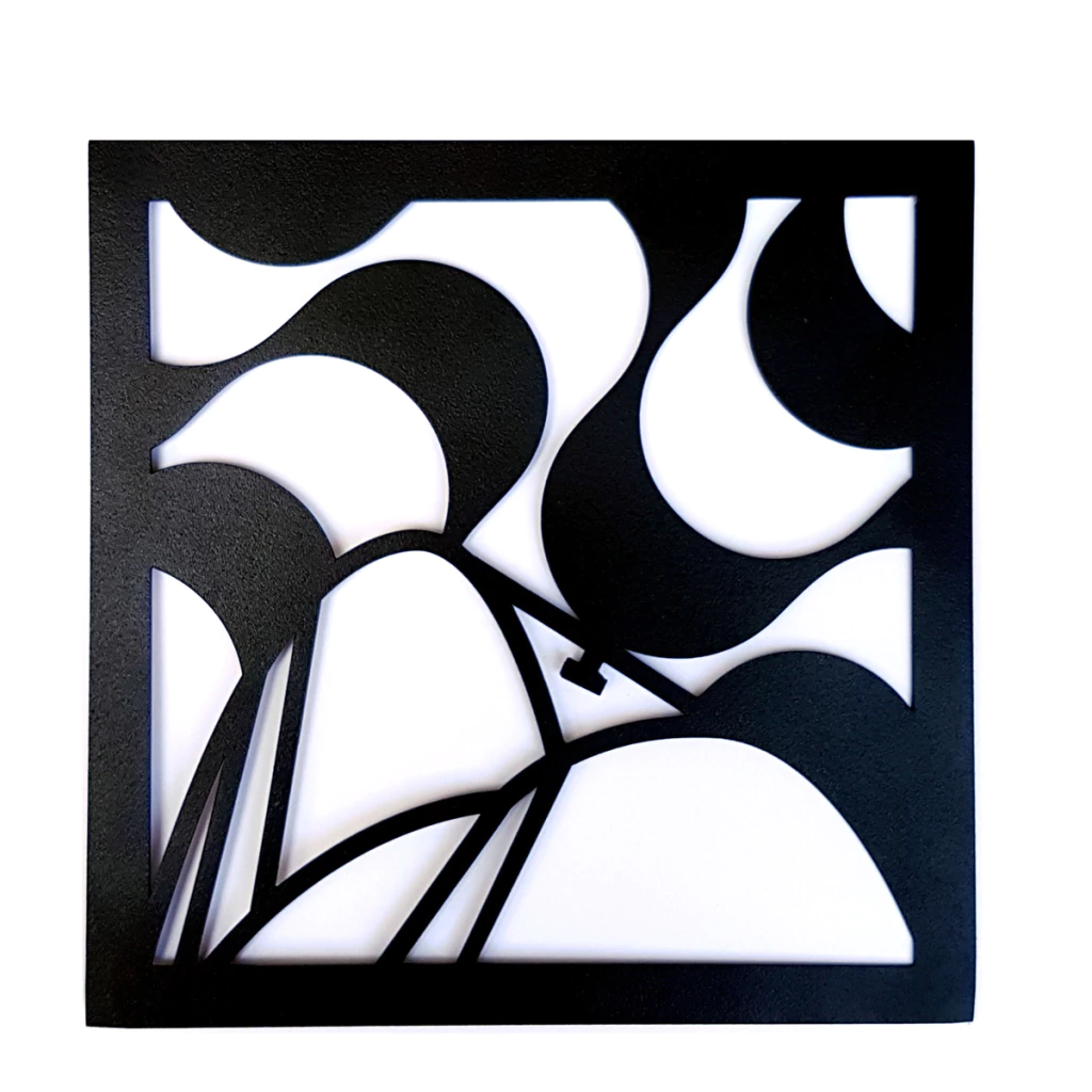 Feito com corte laser no ferro com pintura eletrostática fosca e micro texturizada.