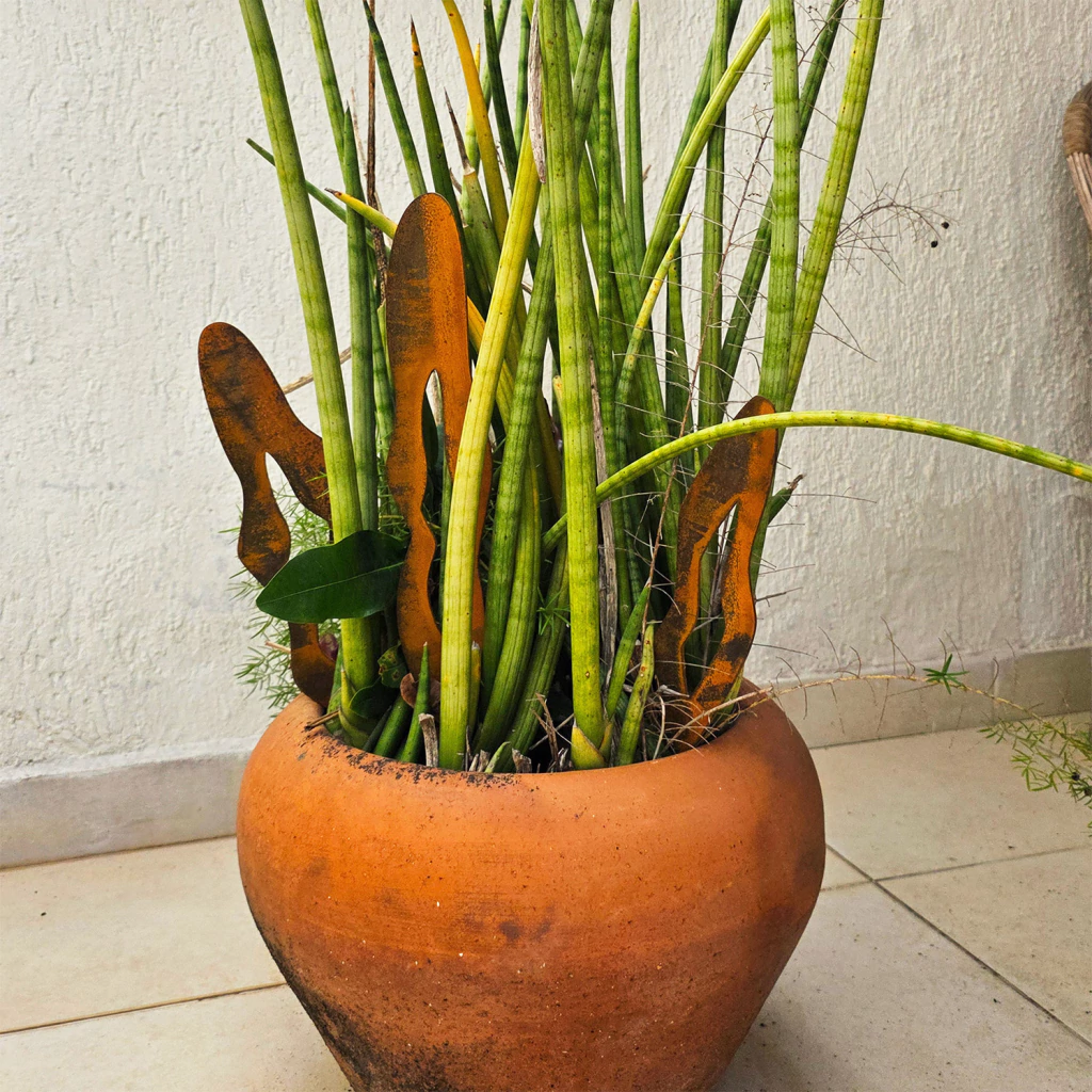 Feita em Aço Corten, esta peça possui um acabamento elegante e naturalmente rústico. A pátina de ferrugem que se forma é sua proteção e sua beleza, garantindo uma cor e textura exclusivas que evoluem com o tempo — uma verdadeira arte viva no seu jardim ou ambiente interno.