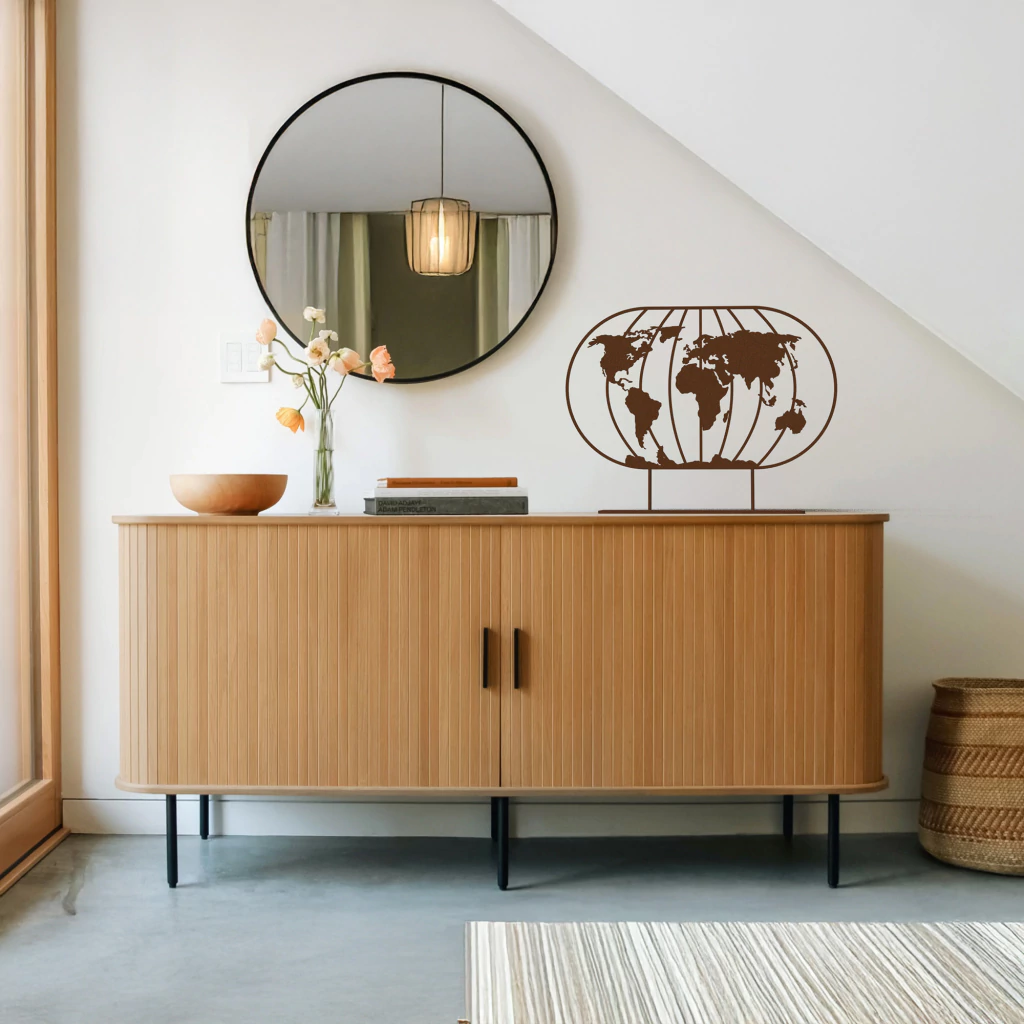 Seja para relembrar destinos inesquecíveis ou planejar as próximas jornadas, esta peça é um convite constante à descoberta. Seu design vazado em metal confere leveza e modernidade, enquanto o acabamento que simula o aço corten adiciona uma textura rústica e um charme atemporal, tornando-a um ponto de interesse visual em qualquer ambiente. É a peça perfeita para adornar seu aparador, estante de livros ou mesa de escritório, servindo como uma fonte diária de inspiração e um reflexo do seu espírito aventureiro.