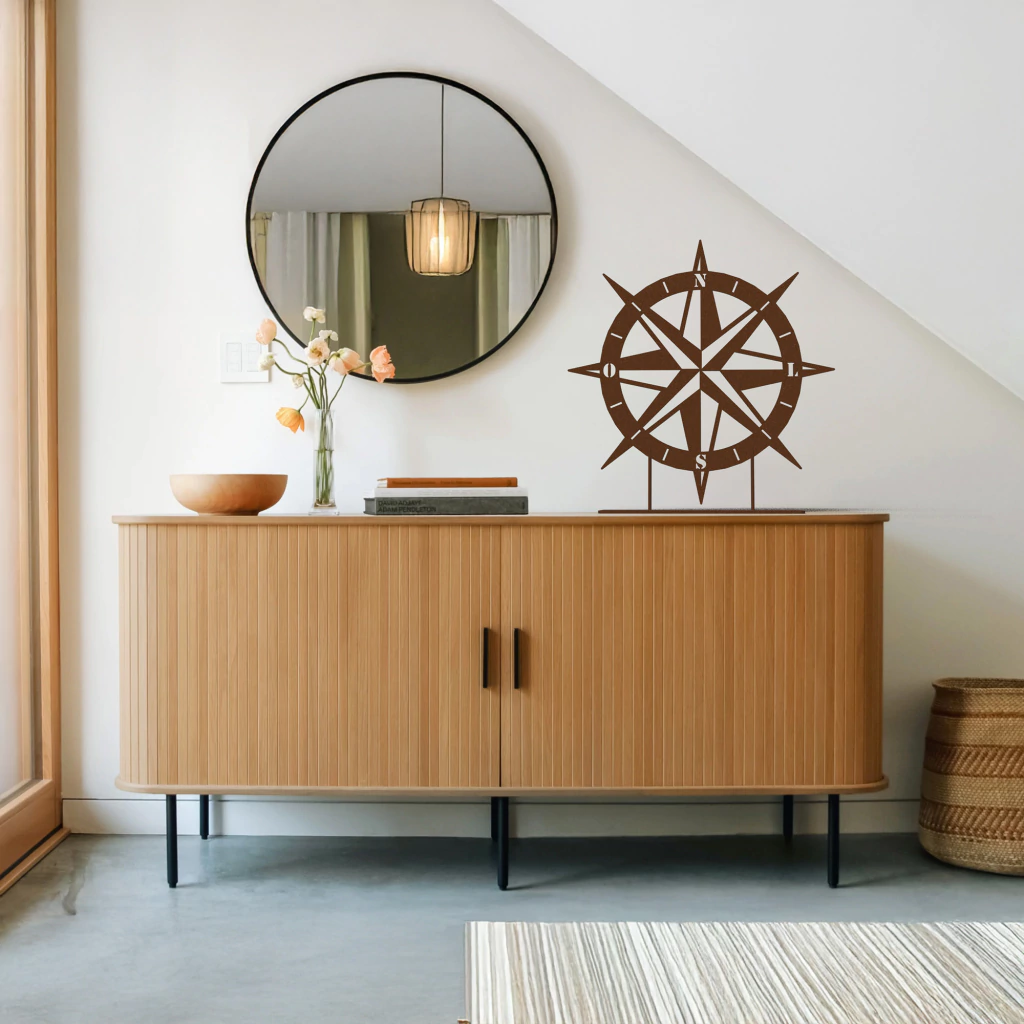 Inspirada nos clássicos instrumentos de navegação, esta peça robusta e elegante é a escolha perfeita para quem tem espírito de explorador. Seu design icônico, representando os pontos cardeais, adiciona um toque de inspiração e um senso de direção a aparadores, estantes ou mesas de escritório. A pintura eletrostática, que simula o charme rústico do aço corten, confere uma textura e uma presença visual marcantes, garantindo que esta escultura dialogue com diversos estilos de decoração, do industrial ao náutico. É o presente ideal para viajantes e sonhadores, uma peça que materializa a busca por novos horizontes e a beleza de ter um norte para seguir.